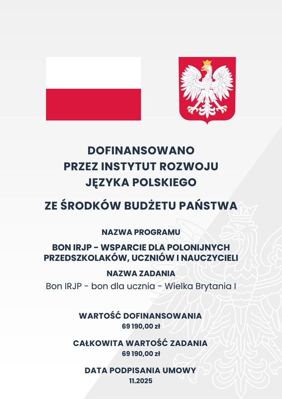 Przedsięwzięcie „Bon dla ucznia – Wielka Brytania I” sfinansowane przez Instytut Rozwoju Języka Polskiego ze środków budżetu państwa, w ramach konkursu „Bon IRJP - wsparcie dla polonijnych przedszkolaków, uczniów i nauczycieli”, realizowane przez Fundację Wolność i Demokracja.